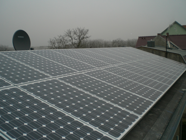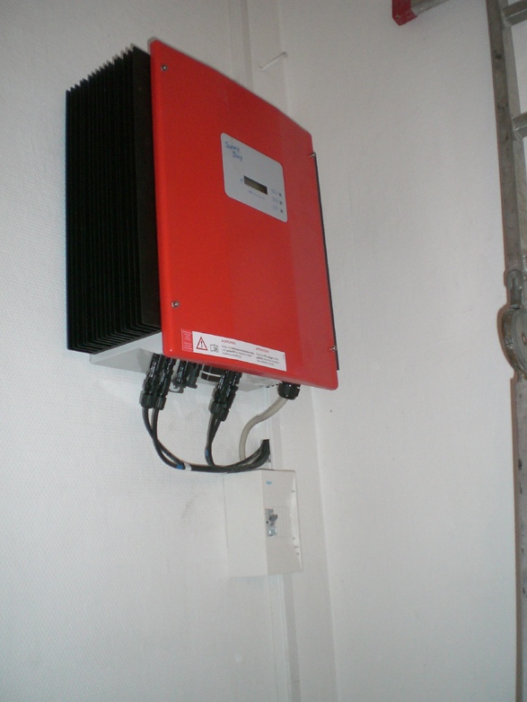 mit Solarmodulen, Wechselrichter und Einspeisung in das Ortsnetz, hier in